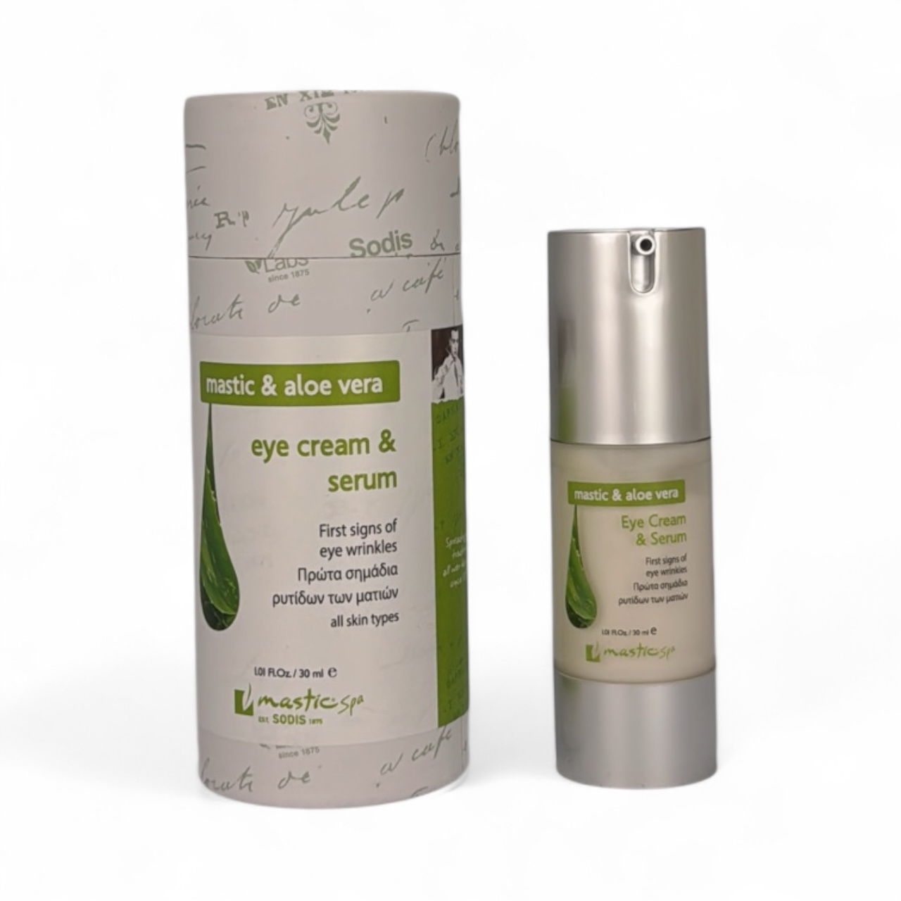 Προϊόν διπλής δράσης (ορός & κρέμα) που δρα κατά των ρυτίδων των ματιών. Η αγνή σύνθεση και ο συνδυασμός της Αλόης με τη Μαστίχα αλλά και οι βιταμίνες Α και Ε βελτιώνουν την μικροκυκλοφορία, με αποτέλεσμα να υποχωρούν οι μαύροι κύκλοι και οι σακούλες γύρω από τα μάτια. Τα βιολογικά εκχυλίσματα καταπραΰνουν την επιδερμίδα, αφήνοντας την λαμπερή.