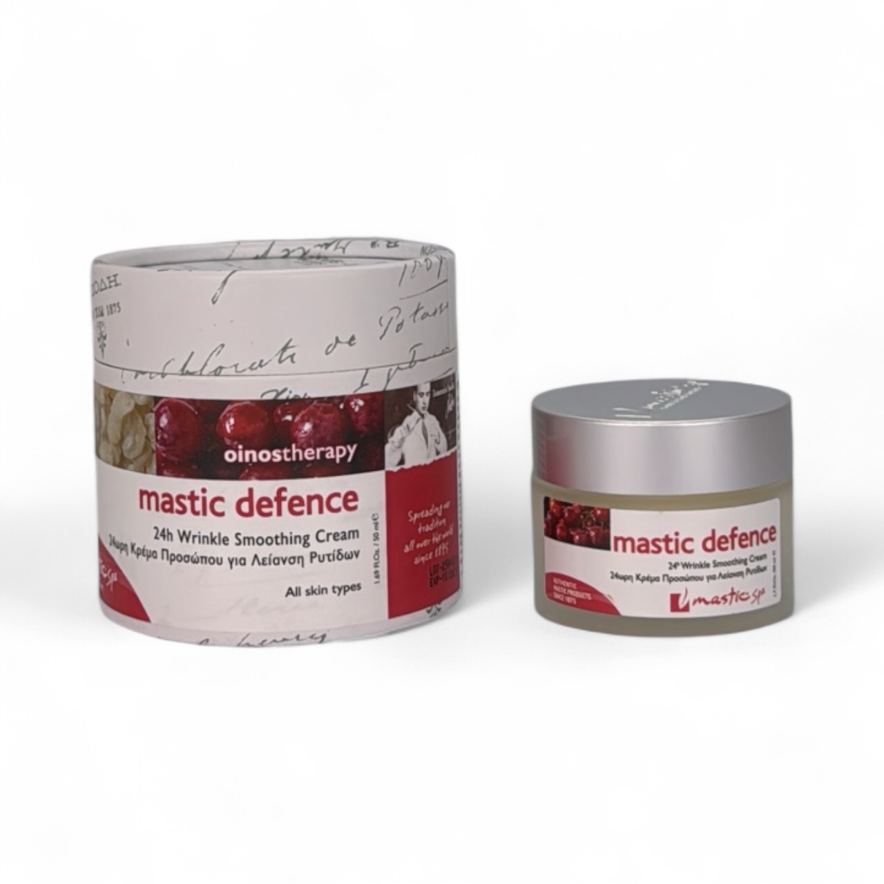 Κλινικά αποδεδειγμένη με μαστίχα Χίου και κόκκινο κρασί με μυοχαλαρωτική, βοττοειδής επίδραση (bοtοx). Το κρασί ενεργοποιεί την παραγωγή του κολλαγόνου της ελαστίνης και του υαλουρονικού οξέως με αποτέλεσμα την ανάπλαση και ενυδάτωση της επιδερμίδας. Οι υδατοδιαλυτοί προανθοκυανιδίνη από σπόρους σταφυλιού με βιταμίνη Ε δρα σαν αντιγηραντικός και στυπτικός παράγοντας και συμβάλλει στην μείωση των ερεθισμών του δέρματος. Η επιδερμίδα διατηρεί την λάμψη και την νεανική όψη, ενώ τα βιολογικά εκχυλίσματα καλέντουλας και centella έχοντας επανορθωτικές ιδιότητες εμποδίζουν την δημιουργία ρυτίδων απαλύνοντας και γαληνεύοντας ταυτόχρονα το δέρμα.